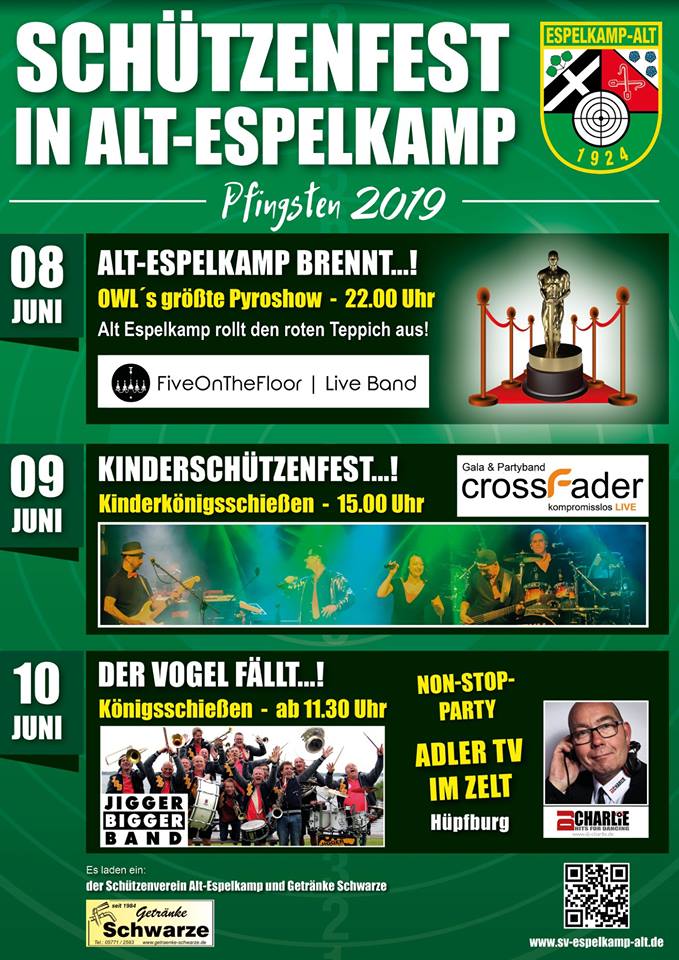 Am Pfingstsamstag spielt für Euch zum Auftakt des Schützenfestes die FiveOnTheFloor - Live Band. Die Band, bestehend aus 4 Musikern und einer Frontfrau, wird uns am ersten Abend einheizen. Am Pfingstsonntag steht erstmals die Partyband CrossFader für euch auf der Bühne unseres Festzeltes und sorgt für ordentlich Stimmung. Lasst euch durch das breite Songspektrum der Band inspirieren und tanzt mit! Am Pfingstmontag während und nach dem Adlerschießen spielt die 14-köpfige Jigger Bigger Band aus Holland mit ihrem einzigartigen Brass-Marching-Sound seit über 14 Jahren auf. "Mit Pauken und Trompeten über die Tische", ist für die Jungs bekanntlich kein Problem.